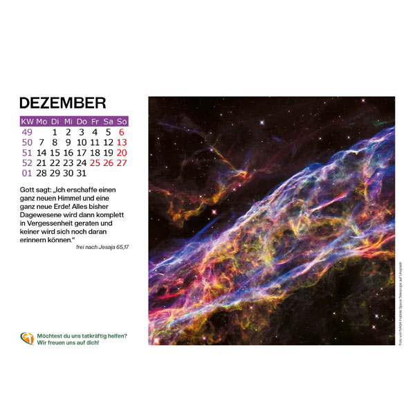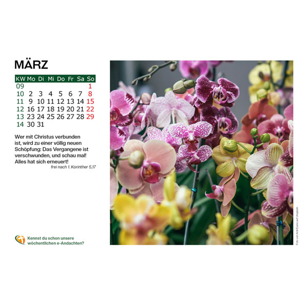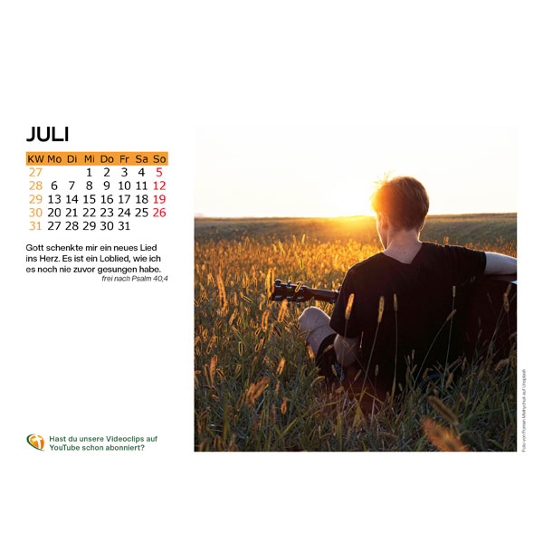 Der Kalender greift das Thema der Jahreslosung auf und lädt dich ein, inmitten eines stressigen Alltags immer wieder mal eine Pause einzulegen, damit deine Seele zur Ruhe kommt.